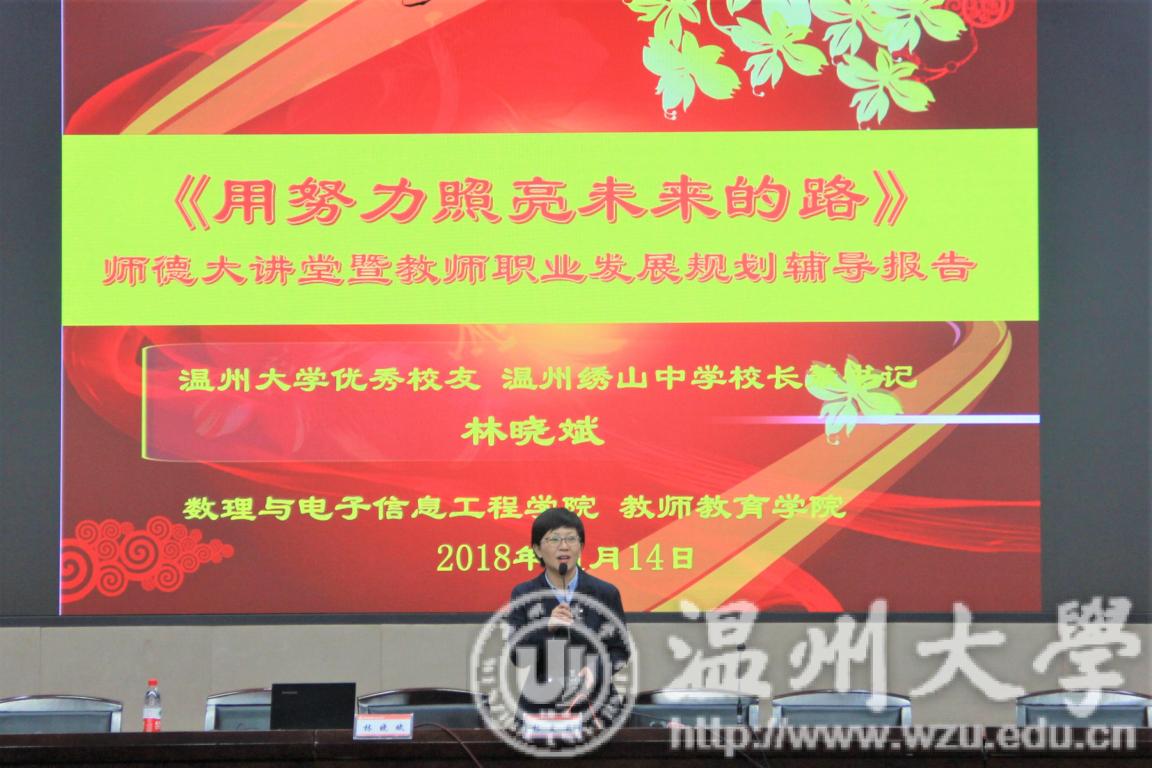 11月14日晚,成人色情 岩松堂雁山厅开展了以“用努力照亮未来的路”为主题的师德大讲坛暨就业规划辅导报告会。本次讲坛由成人色情 优秀校友、成人色情 特聘就业顾问、现温州绣山中学校长兼书记林晓斌老师主讲。数理与电子信息工程学院党支部书记林爱菊、教师成人色情 党委副书记杨丽君以及数电学院和教院的部分学生参与本次活动。本次活动由林爱菊书记主持。
