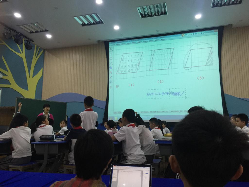 温州市仰义二小的林迪、陈柯柯、杜长华,工作站校外导师浙江省小学数学特级教师林彬名师工作室的钱春蕾、孙雪倩、钟巧智六位老师分别展示了《平行四边形的面积》、《反比例》、《轴对称图形》、《四边形内角和》、《比例的意义》、《图形的运动整理与复习》。她们在课堂上进行了运用与不运用“几何画板”的比较,为下面针对课例的议课研讨提供了很好的素材。