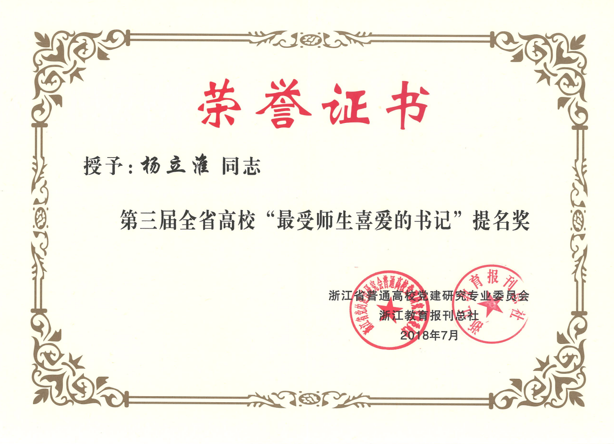 近日,浙江省普通高校党建研究专业委员会、浙江教育报刊总社公布了第三届全省高校“最受师生喜爱的书记”名单,我校教师成人色情 党委书记杨立淮获得“最受师生喜爱的书记”提名奖。