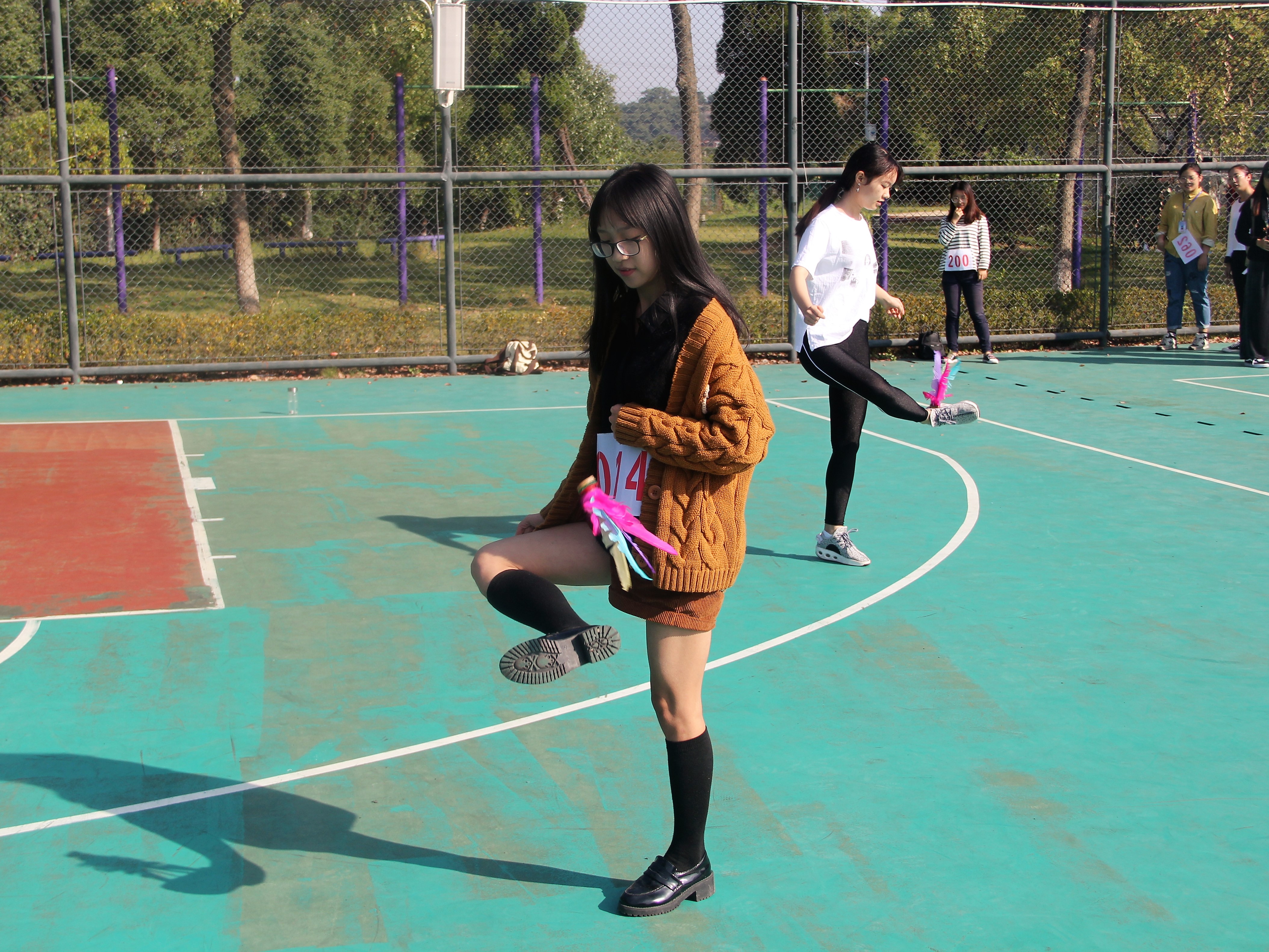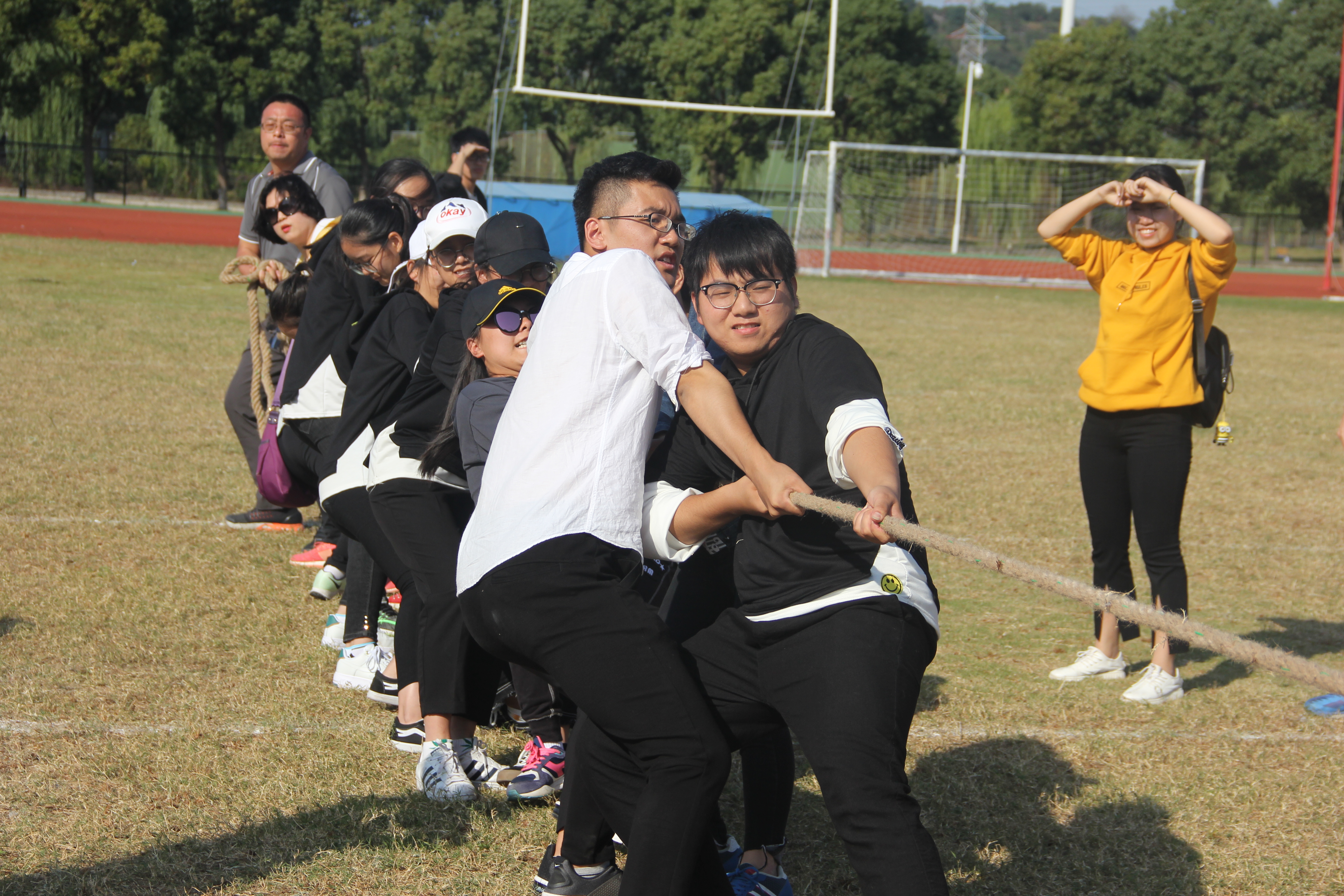 其中,教职工参加的运动会项目有往返运球上篮、跳大绳、定点投篮、10×80接力赛。研究生参与的运动会项目有懒惰自行车、摸石过河、定点投篮和集体项目:三人四足。在班级团体比赛中,师生共同的参与项目有20×80迎面接力、智传呼啦圈、集体跳大神、拔河、4×100米接力赛。比赛场上除了赛员们的拼搏,更多的是洋溢着师生的欢乐,这充分的体现了这次师生趣味运动会的宗旨。拔河场上,参赛老师与选手们拼尽全力,用力拉紧自己手中的长绳,喊着整齐的口号。观赛的同学们热情助威,师生气氛达到高潮。