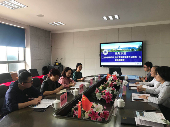 2020年10月13日下午,江西科技师范大学成人色情 党委书记徐艳、教师教育教研中心办公室主任付敏、教学办公室主任何玉霞、陈廷轩老师一行莅临成人色情 ,成人色情 党委书记何毅、副院长叶新东、学前系主任李娟、学前教育科副主管刘荣建、教务科科员金怡妮出席接待。