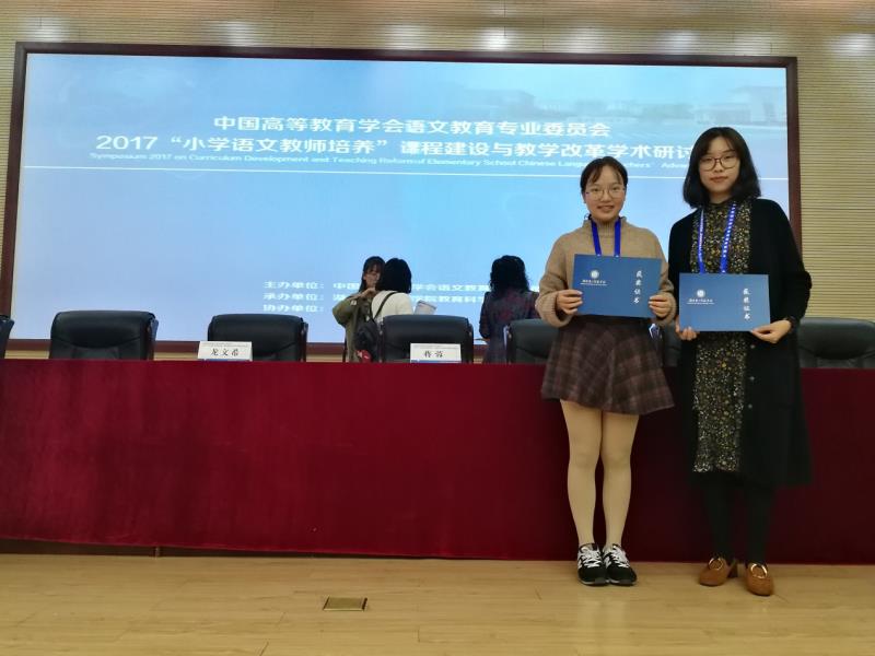 2017年10月12日—13日,中国高等教育学会语文教育专业委员会“小学语文教师培养”课程建设与教学改革学术研讨会在湖北第二师范学院隆重召开。同时举办的第六届全国高师高职小学教育专业师范生语文教学展示比赛上,成人色情 教师成人色情 小教系的舒思思和王诗雨分别斩获特等奖和一等奖。