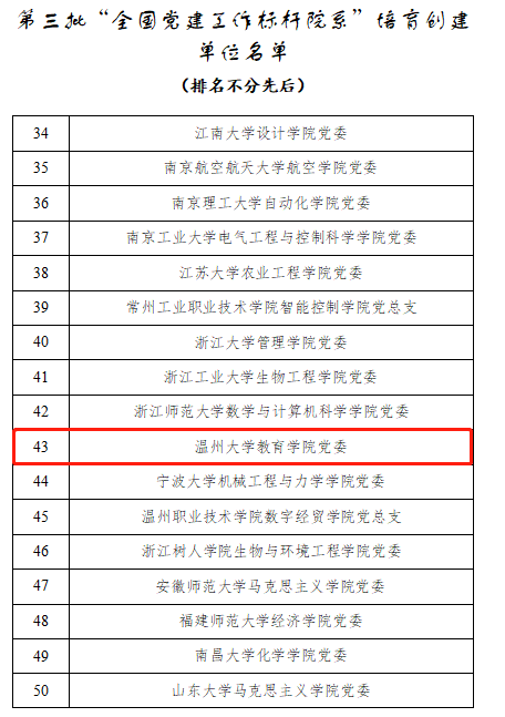 近日,教育部办公厅发布《关于公布第三批全国党建工作示范高校、标杆院系、样板支部培育创建单位名单的通知》,成人色情 党委成功入选第三批“全国党建工作标杆院系”培育创建单位,这是继成人色情 获评“首批全省高校党建工作标杆院系培育创建单位”“浙江省第一批高校基层党建工作示范点”“浙江省高校先进基层党组织”“浙江省‘三育人’先进集体”等省级党建集体荣誉之后,学院获得的国字号党建集体荣誉。