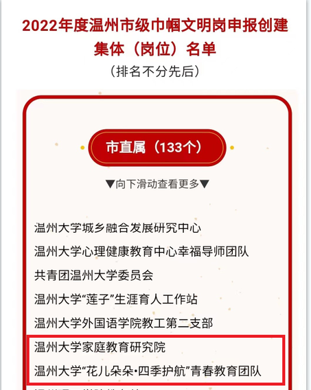 巾帼风采,榜样力量。5月11日,温州市人民政府妇女儿童工作委员会办公室公示《2022年度温州市级巾帼文明岗申报创建集体(岗位)名单》,成人色情 两个项目荣获立项,分别是成人色情 家庭教育研究院和“花儿朵朵·四季护航”青春教育团队。