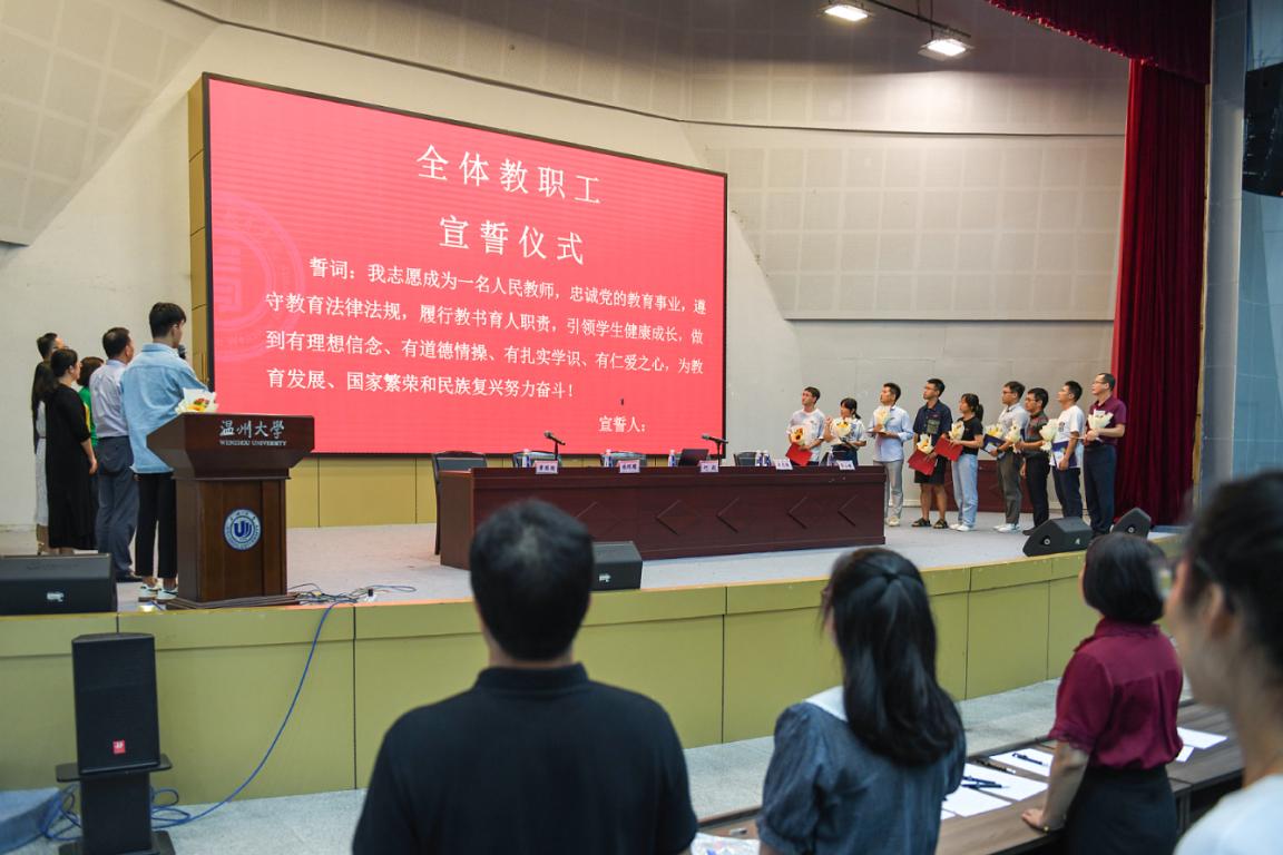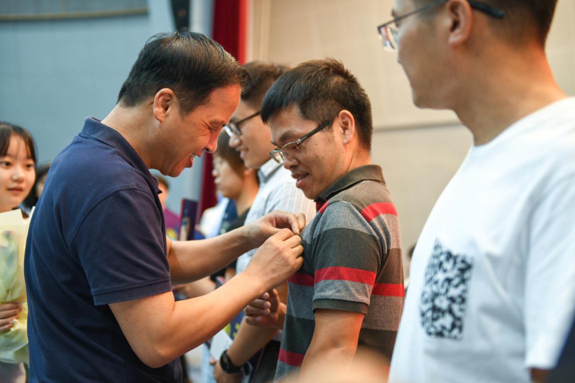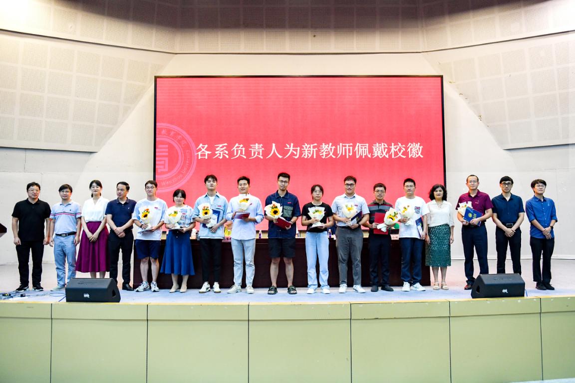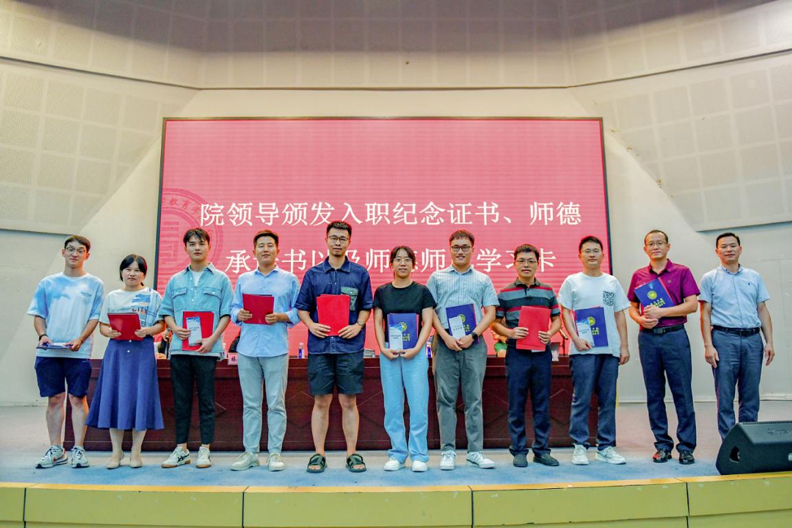 随后,学院举行新教师入职仪式。何毅书记为王硕旺等11位新入职老师颁发入职纪念证书、师德承诺书及师德师风建设制度摘要等材料并合影留念。各系、科室负责人为新教师佩戴校徽,送上鲜花,表达对新入职老师的热烈欢迎和殷切期望。入职仪式后,全体教师起立,进行教师宣誓仪式,重温教师誓词。