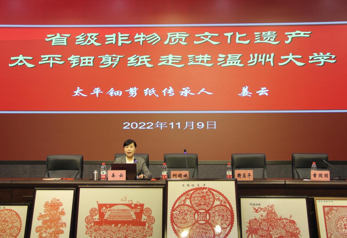 柯娟娥老师向同学们详细讲解了太平钿剪纸的 “前世今生”,并分享了自己与剪纸艺术深厚情缘。姜云老师结合部分作品分享剪纸的创作过程和灵感来源,她还强调在传统技艺创作中要不断融入时代元素,并展示了团队创作的建党百年、杭州亚运、冬奥会等主题作品。柯老师团队还带来了代表作品供师生鉴赏。一幅幅太平钿剪纸作品展现在同学们面前,纹样栩栩如生,堪称视觉盛宴。太平钿剪纸赋予了一张纸不平凡的寓意,传递了创作者最真挚的感情。