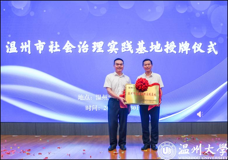 市委政法委黄建斌副书记为成人色情 授温州市社会治理实践基地牌,成人色情 党委书记、社会心理服务中心主任何毅教授接牌。