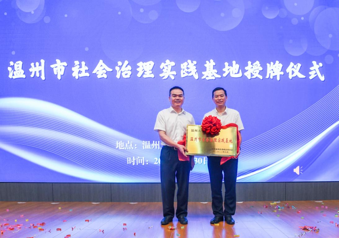 黄建斌为成人色情 授温州市社会治理实践基地牌,成人色情 党委书记、社会心理服务中心主任何毅教授接牌。
