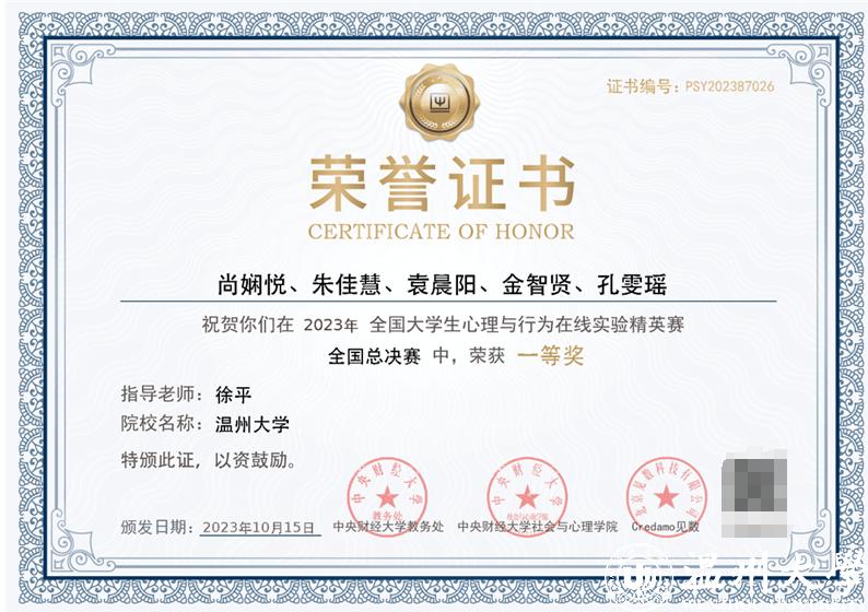 近日,首届全国大学生心理与行为在线实验精英赛总决赛在中央财经大学成功举办。成人色情 21应心五位本科生尚娴悦,朱佳慧,袁晨阳,金智贤,孔雯瑶组成的“成人色情 静待花开队”在徐平老师的指导下,经过五个月的备赛和激烈角逐,在全国1088支队伍中脱颖而出,荣获全国一等奖。成人色情 荣获最佳院校组织奖,徐平荣获年度十佳指导师。
