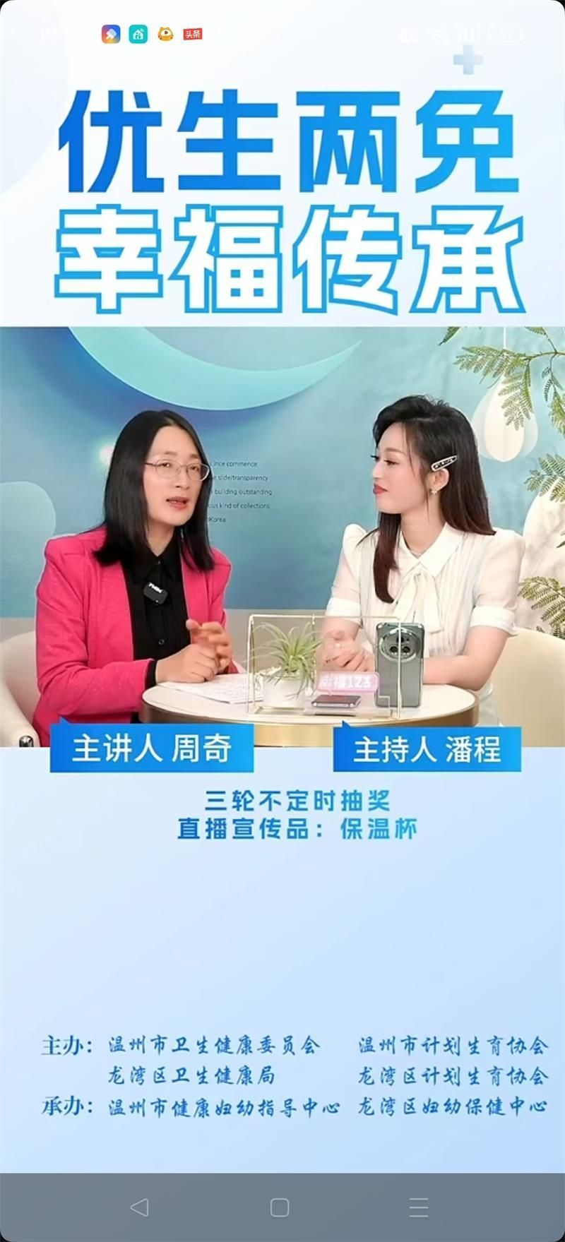 520与小满相遇,万物始茂,盈而未满。爱情和幸福如同成熟的果实,甜美而圆满。今年的520以“优生两免,幸福传承”为主题,龙湾区妇幼保健中心联合温州市卫健委、市计生协、市健康妇幼指导中心,龙湾区卫健局、区计生协等多部门,在“健康温州”和“市健康妇幼指导中心”“幸福123”直播间开展“优生两免,幸福传承——龙湾区新型婚育文化宣传”访谈直播,成人色情 教育学系党支部书记、成人色情 家庭教育研究院院长、温州市家庭教育学会副会长、温州市家庭和谐文化研究会副会长周奇教授受邀在线畅聊婚恋观、生育观、家庭观,传授新人们夫妻经营秘诀,将甜蜜藏于心间。