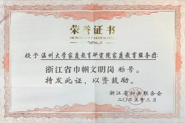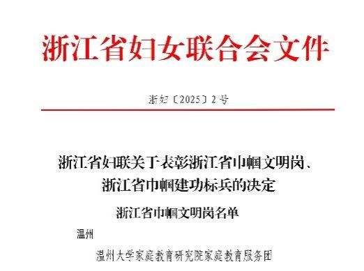 在第115个“三八”国际劳动妇女节,浙江省妇女联合会发布《关于公布浙江省巾帼文明岗、巾帼建功标兵的通知》,成人色情 家庭教育研究院家庭教育服务团队荣获浙江省“巾帼文明岗”荣誉称号。这是成人色情 第二个团队获此殊荣,充分彰显了学校妇联在推动妇女事业和教育发展方面取得的显著成效。