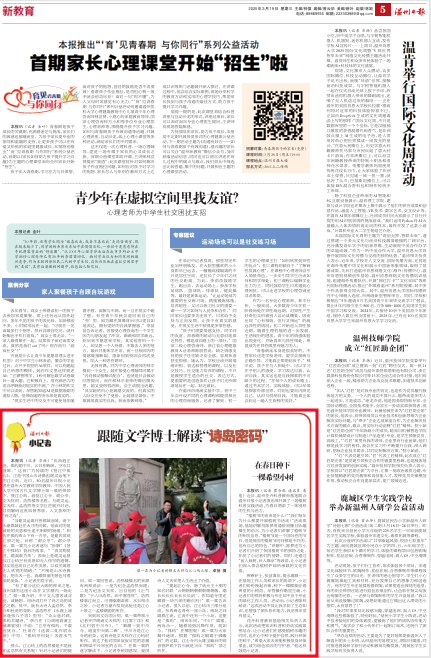 “乱流趋正绝,孤屿媚中川。云日相辉映,空水共澄鲜。”这首广为传颂的《登江中孤屿》,正是中国山水诗鼻祖谢灵运笔下的江心屿。上周六,50名温州日报小记者在成人色情 教师、中国人民大学中国古代文学博士梁一粟的带领下,登江心屿,游览江心寺、谢公亭、文天祥祠、浩然楼等名胜,与谢灵运、文天祥、孟浩然等文学巨匠展开对话,共同解码这座风景秀丽、人文荟萃的“诗之岛”。