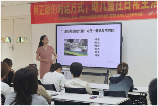 活动现场,李晓燕教授结合长期一线研究经验,通过生动的案例,解析孤独症儿童的语言沟通表现,并强调语言康复为四大特质的阶梯论,即:先让孩子想交流(会话意识),再敢交流(会话关系),然后有词可用(会话内容),最终能连贯表达(会话组织)。家长需像“搭积木”一样层层推进,而非急于求成。“每个孩子都有自己的‘沟通密码’,家长既是解码者,更是引路人。”李教授表示,家庭日常互动中的细节调整——如模仿儿童动作、语速语调控制、情境创设等,都可能成为打开孩子语言潜能的“金钥匙”。