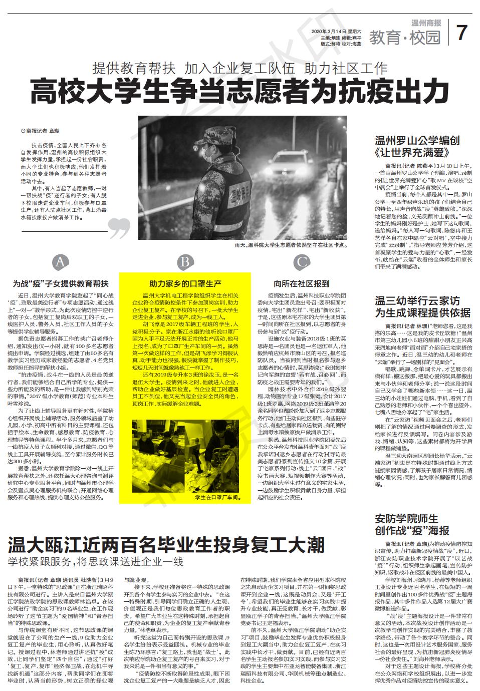抗击疫情,全国人民上下齐心各自发挥作用,温州的高校积极组织大学生发挥力量,承担起一份社会职责,而大学生们也积极响应,他们发挥着不同的专业特色,参与到各种志愿者活动中去。