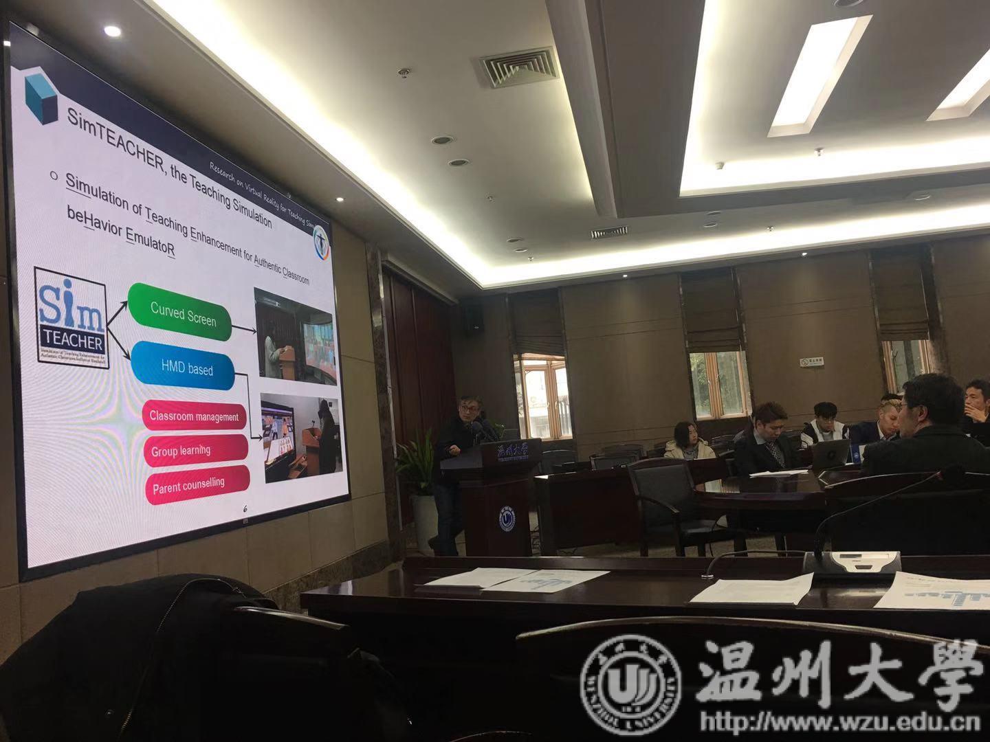 论坛上,中日韩教育技术学专家围绕教育教学中的虚拟现实技术应用成果,进行探讨交流。韩国全南大学柳志献教授就“关于教学模拟训练的虚拟现实环境开发研究”进行主旨发言。他指出情境学习、体验认知、情境兴趣是虚拟现实环境的核心因素,通过真实课堂行为模拟器的教学强化模拟,可以帮助师范生掌握课堂管理、指导学习、应对咨询等技能。而在日本福祉大学佐藤慎一教授看来,360度VR技术有助于体验式学习的分享与交流,也有利于缓解师范生的海外研修资金压力。来自温大教师成人色情 教育技术系的杨刚博士、邱创楷博士以及赵安平博士围绕SVVR虚拟现实技术的学习资源设计与开发,以及SVVR在基础教育中的教学应用做出的一系列实证研究进行了详细的介绍与分享,并指出未来中小学课堂借助虚拟现实资源能够强化学生的学习认知能力,提升学生学会学习的能力。