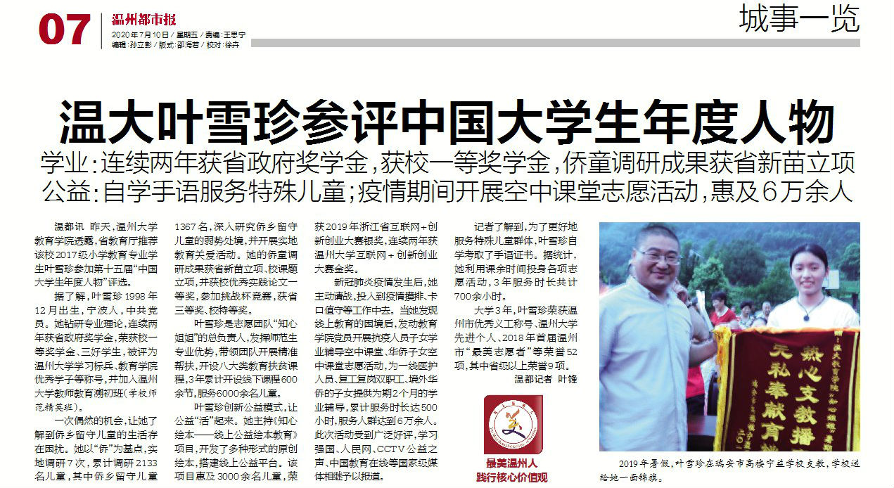 大学三年,叶雪珍“硕果累累”,共荣获温州市优秀义工称号、成人色情 先进个人、2018年首届温州市“最美志愿者”等荣誉52项,其中省级以上荣誉9项。