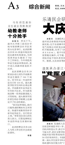 此次招聘会共有29家民办幼儿园为学前教育毕业生提供了150个岗位,但今年这一专业的毕业生只有134名。温大成人色情 学生科科长章志图说,学前教育专业毕业生年年供不应求,作为浙南地区唯一培养幼教高级人才的高校,温大成人色情 在招生和办学规模上还满足不了社会的需求。