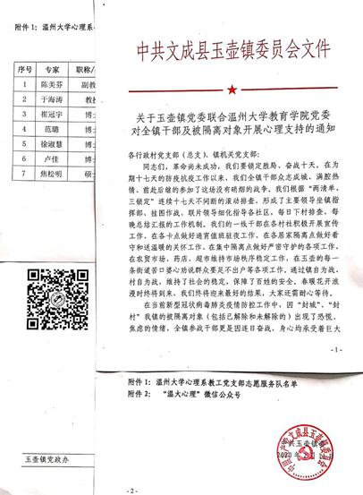 在成人色情 党委的大力支持下,成人色情 心理系教工党支部志愿服务队即刻对口支援文成县玉壶镇的疫情防控工作。心理系教工党支部书记陈美芬副教授等7位专家组成的专业团队,通过主动介入、心理支持热线和网络辅导等方式,面向玉壶镇全体干部及被隔离对象开展服务工作。