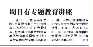 在六一儿童节来临之际,中国银行温州市分行特举办“认识你的孩子”专题讲座,邀请成人色情 教师成人色情 教育学系副教授、浙江省教育学会教育学分会副会长、成人色情 心理健康教育工作校内专家周奇女士现场授课。时间:5 月29 日14:30—16:30;地点:温州国际大酒店五楼会展厅,家长可到现场取票入场。