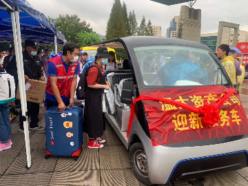 据介绍,疫情防控期间,由于校外车辆无法进入校园,聚焦新生行李多、运送难的问题,校资产公司向全校教师发起“献爱心接学生”迎新活动倡议,组织教师党员志愿者驾驶接送车为新生提供自助式、一站式运送行李服务,新生只需在入校口处登记行李,领取号码牌,就能凭借号码牌在终点处拿取行李。