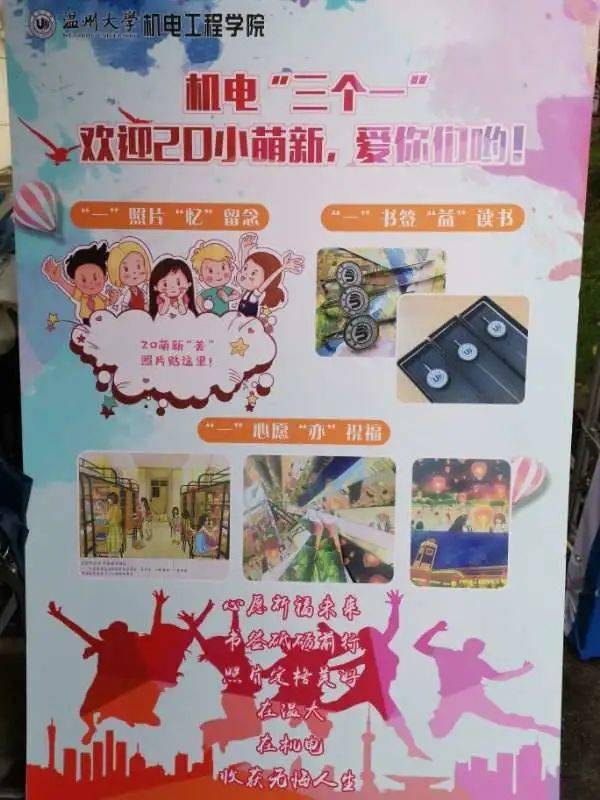 机电工程学院为新生制定三个“一”,即照片“忆”留念、书签“益”读书、心愿“亦”祝福活动,希望新生们在温大、在机电收获无悔人生。