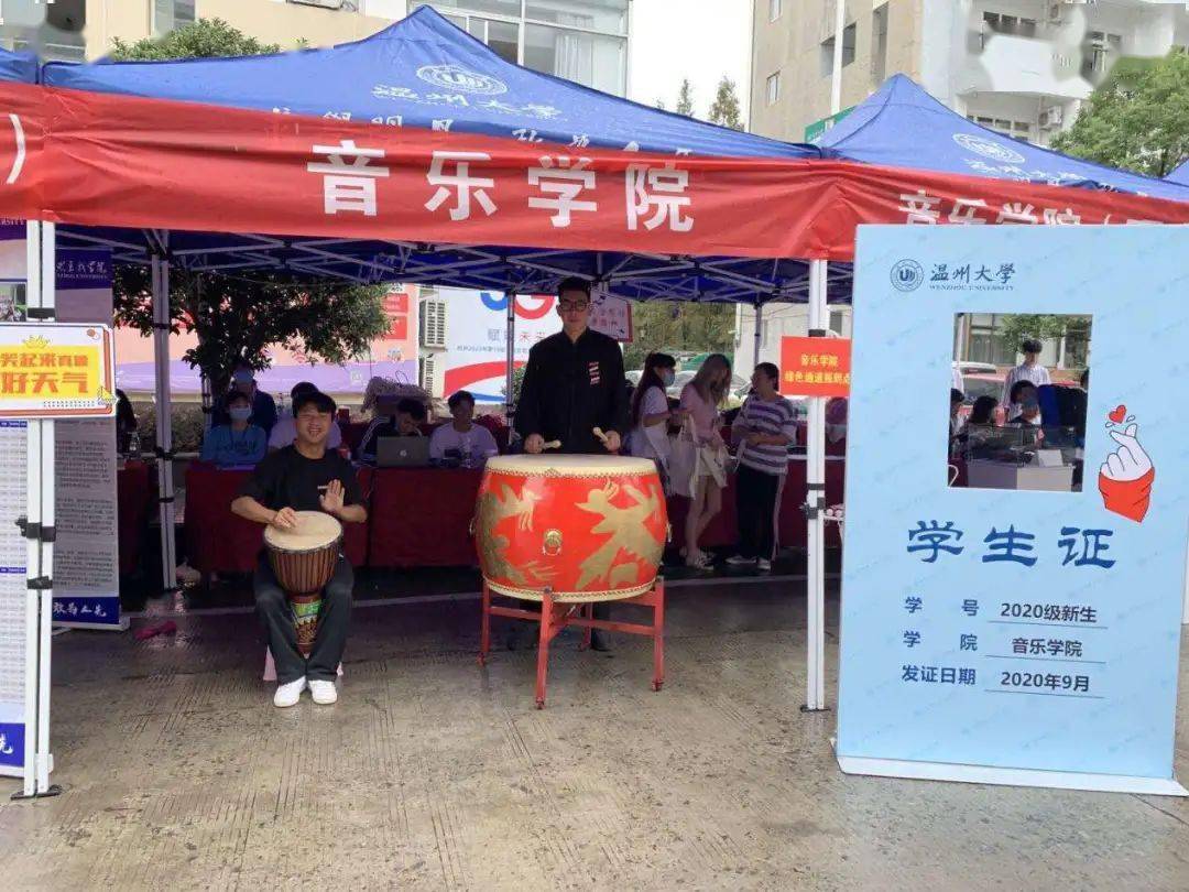 音乐学院鼓乐迎新,还有新生在报到处与学长学姐同唱校歌。