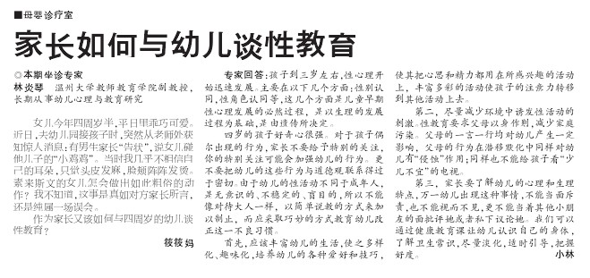 副教授,长期从事幼儿心理与教育研究 女儿今年四周岁半,平日里乖巧可爱。近日,去幼儿园接孩子时,突然从老师处获知惊人消息:有男生家长“告状”,说女儿碰他儿子的“小鸡鸡”。当时我几乎不相信自己的耳朵,只觉头皮发麻,脸颊阵阵发烫。素来斯文的女儿怎会做出如此粗俗的动作?我不知道,这事是真如对方家长所言,还是纯属一场误会。 作为家长又该如何与四周岁的幼儿谈性教育? 筱筱妈 专家回答:孩子到三岁左右,性心理开始迅速发展。主要在以下几个方面:性别认同,性角色认同等,这几个方面是儿童早期性心理发展的必然过程,是以生理的发展过程为基础,是由遗传所决定。 四岁的孩子好奇心很强。对于孩子偶尔出现的行为,家长不要给予特别的关注,你的特别关注可能会加强幼儿的行为。更不要把幼儿的这些行为与道德观联系得过于密切。由于幼儿的性活动不同于成年人,是无意识的、不稳定的、盲目的,所以不能像对待大人一样,以简单说教的方式来加以制止,而应采取巧妙的方式教育幼儿改正这一不良习惯。 首先,应该丰富幼儿的生活,使之多样化、趣味化,培养幼儿的各种爱好和技巧,使其把心思和精力都用在所感兴趣的活动上,丰富多彩的活动使孩子的注意力转移到其他活动上去。 第二,尽量减少环境中诱发性活动的刺激。性教育要求父母以身作则,减少家庭污染。父母的一言一行均对幼儿产生一定影响,父母的行为在潜移默化中同样对幼儿有“侵蚀”作用;同样也不能给孩子看“少儿不宜”的电视。 第三,家长要了解幼儿的心理和生理特点,万一幼儿出现这种事情,不能当面斥责,也不能视而不见,更不能当着其他小朋友的面批评她或者私下议论她。我们可以通过健康教育课让幼儿认识自己的身体,了解卫生常识,尽量淡化,适时引导,把握好度。小林