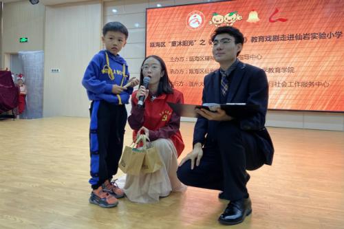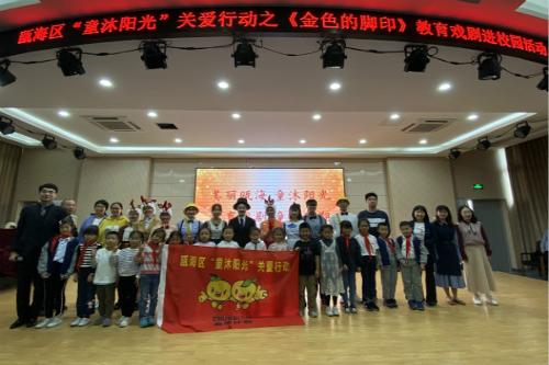 10月30日下午,瓯海区精神文明建设指导中心主办的“童沐阳光”关爱行动特邀成人色情 沐童翎教育戏剧社为仙岩实验小学的学生们带来了课本剧《金色的脚印》的表演。本次共有300多名师生在阶梯教室观看了表演。区文明中心综合科科长仇晓秋、区思想道德教育中心姜若微和仙岩街道人武部副部长夏冯洲莅临参加。