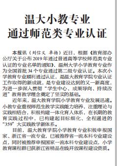 本报讯(刘信义 卓扬) 近日,根据 《教育部办公厅关于公布2019年通过普通高等学校师范类专业认证的专业名单的通知》,成人色情 小学教育专业作为全国首批34个专业通过第二级专业认证。本次小学教育专业顺利通过认证,是温大成人色情 专业认证工作取得的新成就,是专业建设达到的又一新高度,为进一步深入贯彻“学生中心、成果导向、持续改进”教育教学理念奠定了坚实的基础。