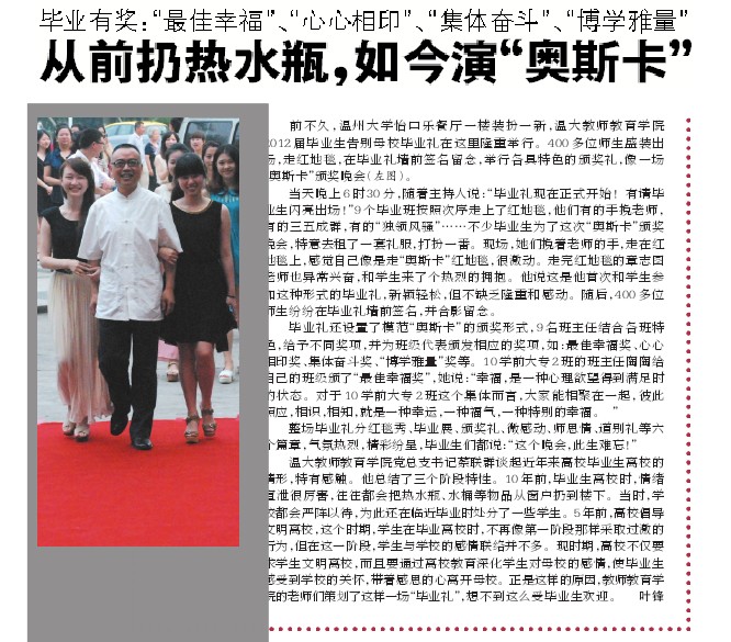 2012届毕业生告别母校毕业礼在这里隆重举行。400多位师生盛装出场,走红地毯,在毕业礼墙前签名留念,举行各具特色的颁奖礼,像一场“奥斯卡”颁奖晚会(左图)。