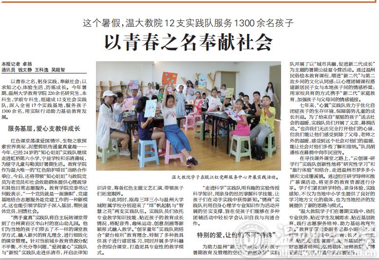 为助力温州“新二代”成长,填补孩子暑期教育及管理的空档,“青愿逐梦”实践队开展了以“城市共融,促进新二代成长”为主题的暑期公益夏令营活动。通过温州民俗绘本教育课程,增进“新二代”与第二故乡间的文化认同感;以心理团辅课程搭建新居民子女与本地孩子间的情感桥梁;用家校共育的方式携手“新二代”家庭教育,加强孩子与父母间的情感链接。