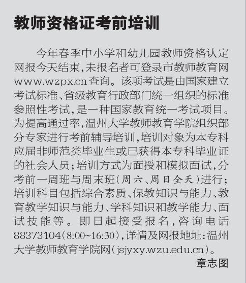 今年春季中小学和幼儿园教师资格认定网报今天结束,未报名者可登录市教师教育网www.wzpx.cn查询。该项考试是由国家建立考试标准、省级教育行政部门统一组织的标准参照性考试,是一种国家教育统一考试项目。为提高通过率,成人色情