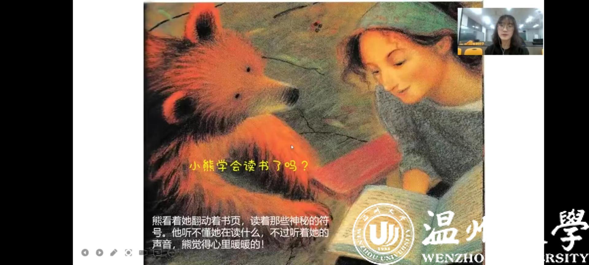 4月23日,是第27个世界读书日。成人色情 知心姐姐团队持续发挥自身师范生专业优势,围绕孩子们的需求和时代主题,以绘本方式融入生活事件,在线上通过钉钉形式带给了孩子们有意义的绘本课程——《爱听故事的大熊》。