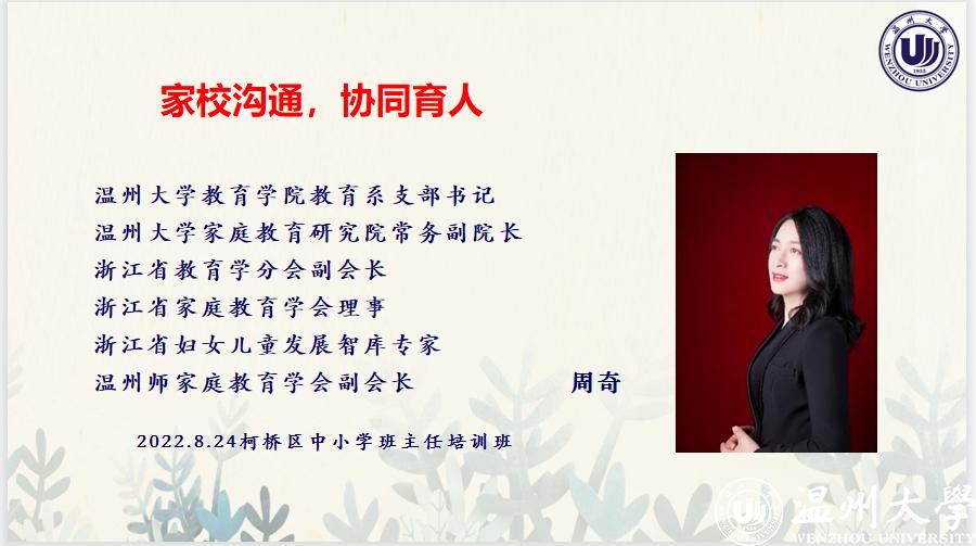 2022年8月24日上午8:30,全国家庭工作先进个人、浙江省妇女儿童发展智库专家、成人色情 家庭教育研究院巾帼文明岗岗长周奇老师受邀线上为绍兴柯桥区中小学优秀班主任培训班做《家校沟通,协同育人》专题讲座。
