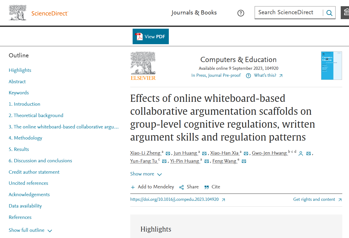 近日,我校成人色情 教育技术系郑晓丽老师团队在教育技术学领域国际顶级期刊《Computers & Education》上,成功发表科研论文《Effects of online whiteboard-based collaborative argumentation scaffolds on group-level cognitive regulations, written argument skills and regulation patterns》(基于白板的在线协作论证支架对群体认知调节、书面论证技能和调节模式的影响)。