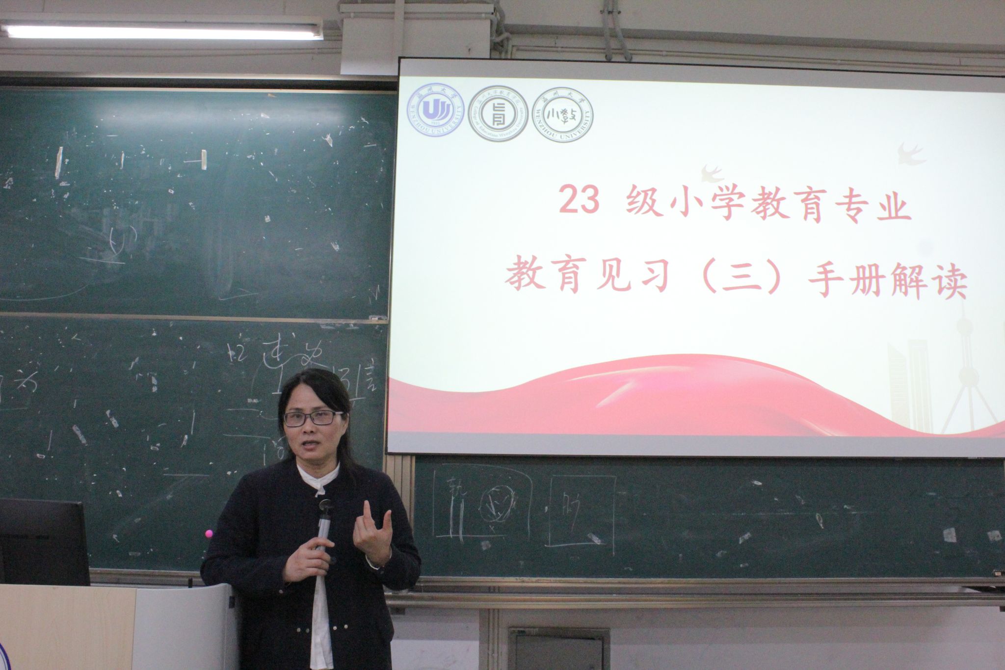 最后,陈海娜老师阐述见习计划和安排,解读见习手册。本次教育见习具体内容为课堂观察与实践、教育调查研究、批改作业、班队工作四个方面。在第二次见习的基础上,陈老师对教育见习(三)进行了一些补充,如增加课堂性质、课堂文化、课堂实践等环节。接着陈老师嘱托同学们需细致研究见习手册,结合所学理论,对作业批改、班队工作、教案设计等内容进行分析和总结。