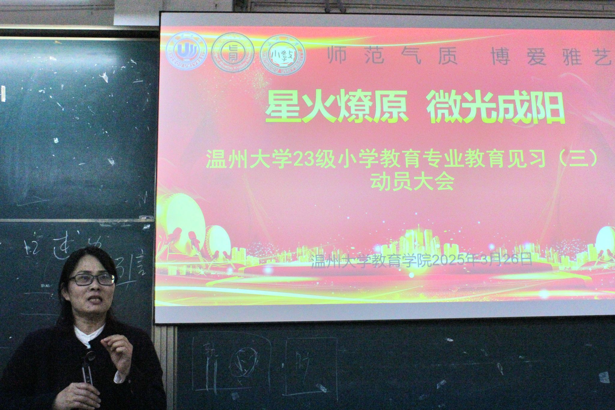 春风和煦,绿意满园。2025年3月26日下午,23级小教学生齐聚温大北校区瓯4-112教室,召开第三次教育见习动员大会。成人色情 林琛琛副院长、小学教育系金丽芳书记,以及各见习点指导老师陈海娜、李默、罗前进等参加动员会。