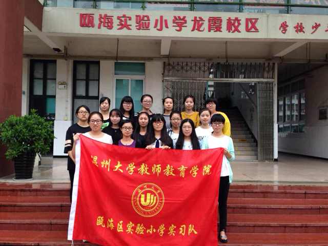 瓯海实验小学龙霞校区实习的16名同学在指导老师徐平的带领下进入校区。