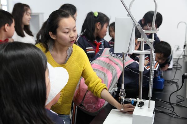 首先来到的是自然科学实验室。看到桌子上的一台台光学显微镜,孩子们的眼睛里马上充满了好奇与向往。我们的志愿者不仅向孩子们一一介绍了人工气候箱、数码显微镜、旋涡混合器、电动玻璃匀浆机等,还手把手教他们使用光学显微镜来观察草履虫装片,用体视显微镜观察蜜蜂、花朵等。同时,每个人都有机会,利用养在实验室里的泥蚶来亲手制作一片血涂片,并在显微镜下进行观察。在机器人实验室,志愿者为孩子们现场模拟了机器人的搬物行为;在天文实验室里,孩子们使用望远镜欣赏远处的风景;在心理实验室,孩子们使用反应测试仪器来测试自己的反应速度;在书法实验室,他们见到了成人色情 学子们优秀的书法作品……
