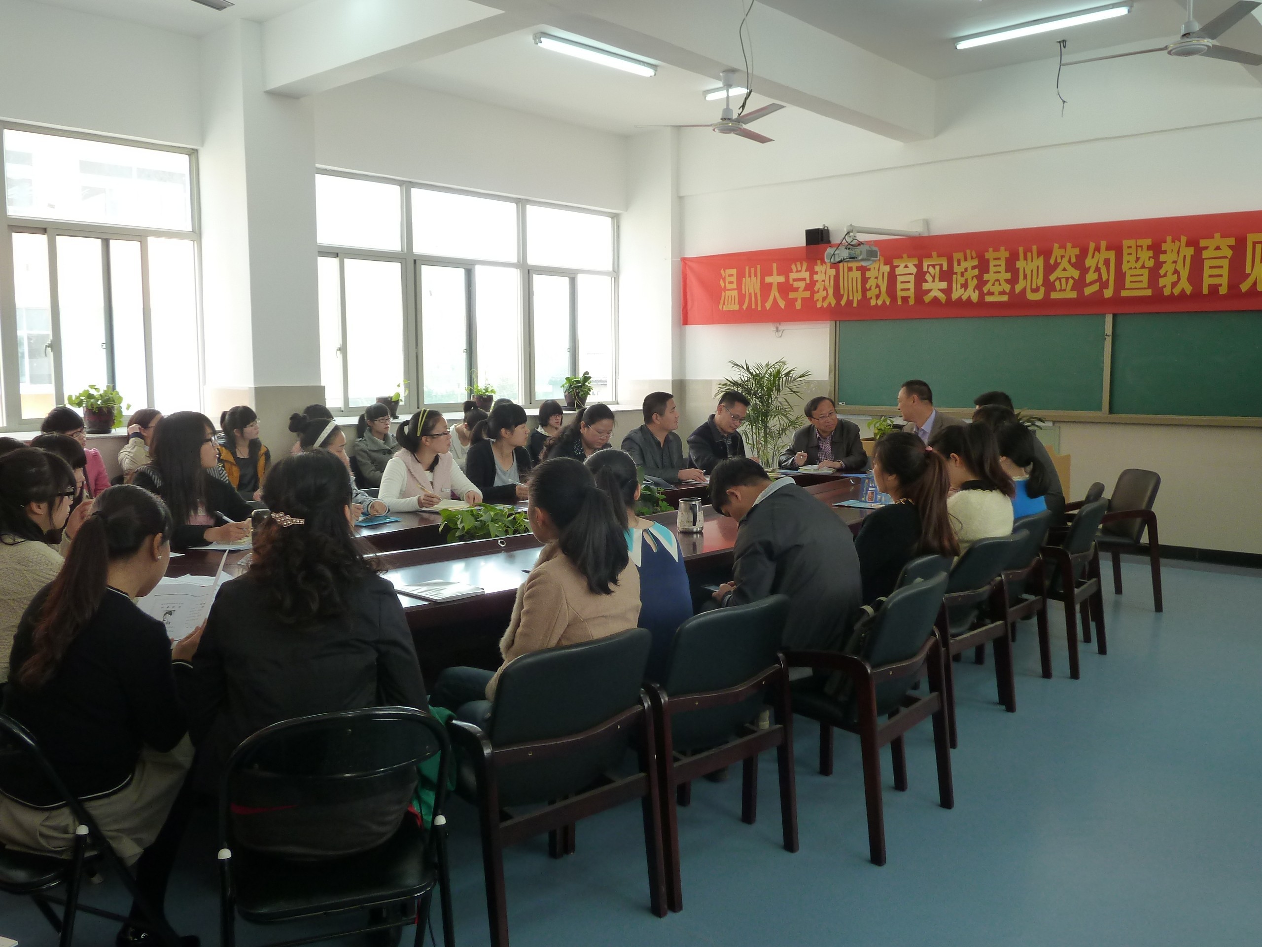 实践基地签约仪式暨教育见习入点仪式”正式开始了。本次仪式由蒋主任主持,林校长首先向我们简要介绍了该校的情况,并鼓励我们在见习时要深入课堂,深入校园,指出了课堂教学研究的重要性。接着温大教师成人色情