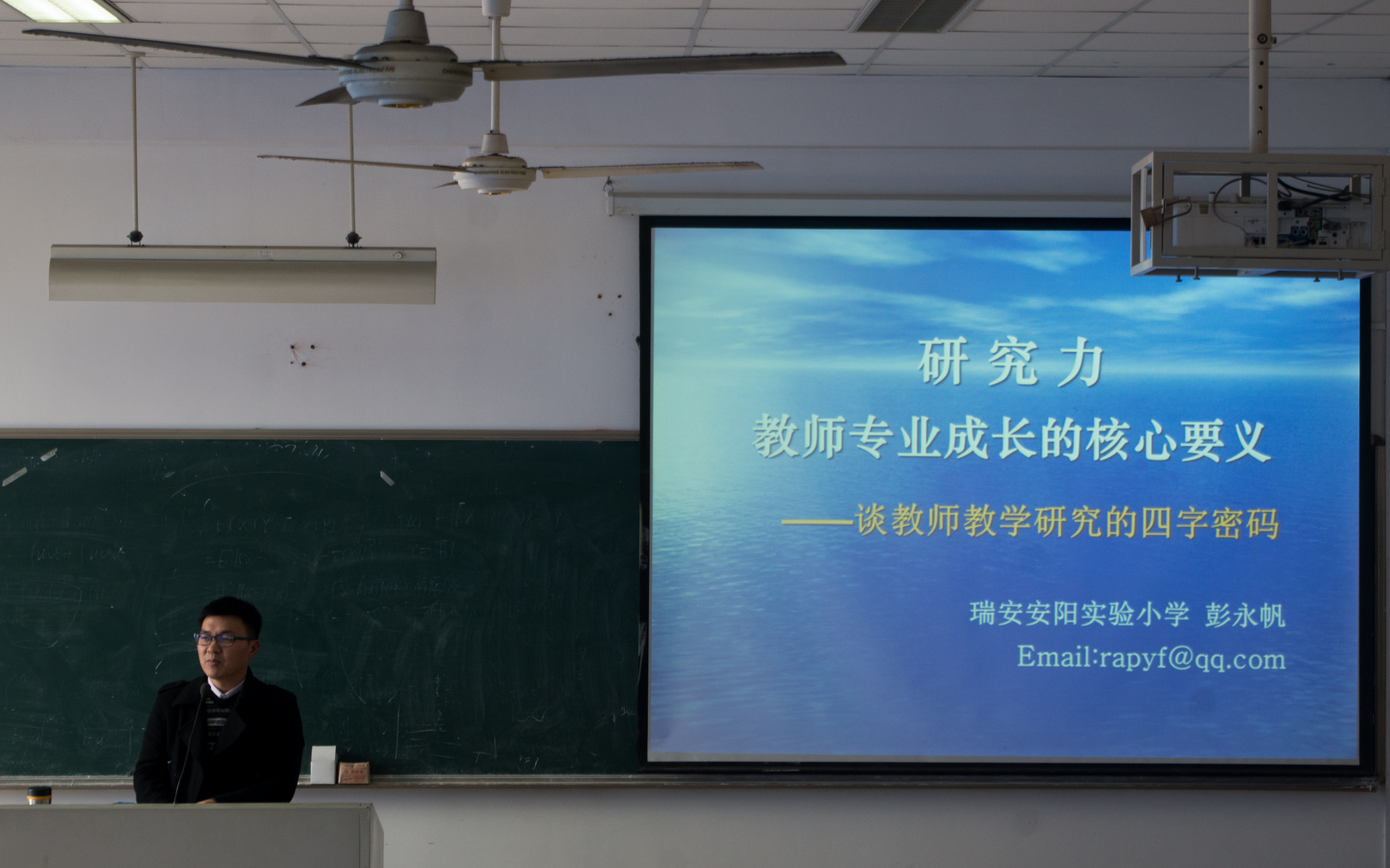 小教系于北校3号教育楼401教室开展了名师大讲堂活动。本次讲座的主讲人由瑞安安阳实验小学副校长彭永帆担任,主题为“研究力:教师专业成长的核心要义”。本次活动由小教系主办,小教工作室承办,小教系谭莉老师主持。