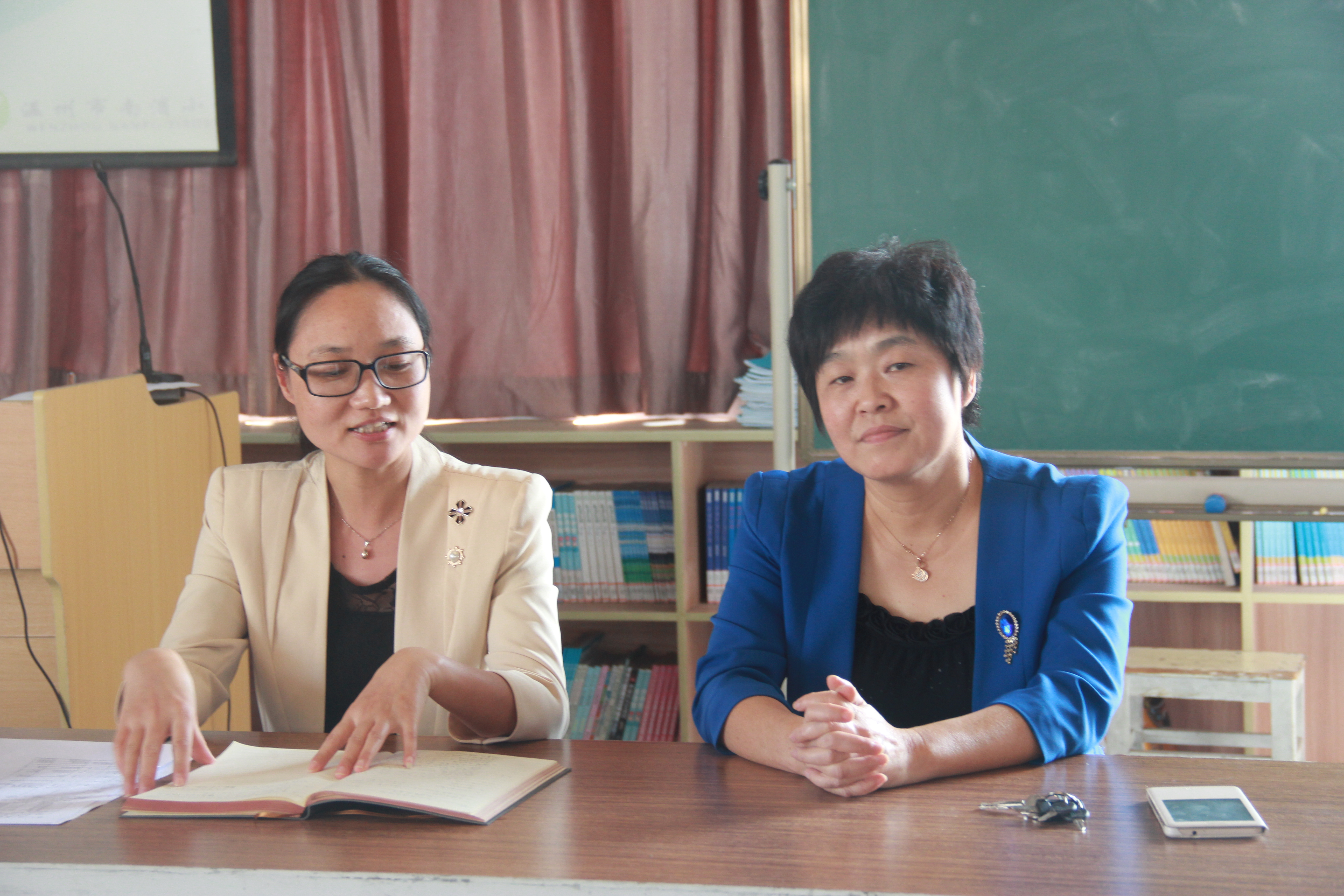 14小教的同学们来到了温州南浦小学进行本学期的见习活动。见习带队老师刘海霞和同学们来到了四楼图书室,这里南浦小学的校长、教导主任、见习指导师代表为温大师生准备了小型的欢迎会。