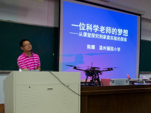 小教系在北校教育楼101室举办了名师大讲堂系列活动。本次讲座邀请到了温州籀园小学少年科学院及家庭实验室计划创建人、全国模范教师、浙江省特级教师陈耀老师与大家分享对科学的见解与梦想。本次讲座由谭莉老师主持,出席本次活动的还有小教系书记刘海霞老师、金建钰老师以及13级全体学生。