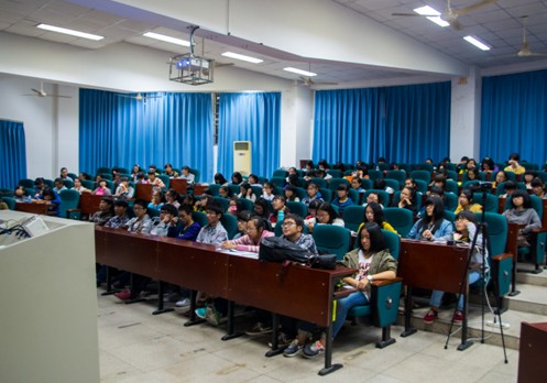 随着一阵热烈的掌声,陈老师翩翩走上讲台。讲座伊始,他与同学们分享了自己的心得体会:1、选择合适自己的路,坚强坚持地走下去。2、看清形势,不走寻常路。本次讲座陈老师围绕他人生的三个维度展开了详细的介绍,分别是:称职的小学科学老师、积极的草根科学研究者和一名优秀的志愿者。首先,陈老师向大家展示了亲手制作的航拍飞行器以及其他模型,充分表现了将科学运用于生活爱好的快乐。其次,陈老师谈及对如何实现一名教师人生价值这一问题的思考,引发在座各位的共鸣。作为一名教师,更在乎的是学生能够喜爱学习,然后去做自己喜欢的事实现梦想,去做志愿者帮助别人开心自己,过有意义的生活。接着,陈老师列举了若干学生做出成功的科研课题的事例,例如“桃花水母”、“抽水马桶节水研究”、“怎样去除刀具的鱼腥味”等等,体现了其痴迷科学,在科学中寻找自我与自信的精神,也深深地鼓舞了在座的各位同学。最后,陈老师勉励并祝福所有在座学生:“科学研究是每个人的权利,人人都要去追梦。祝愿所有同学在大学四年都过得充实、有意义!”