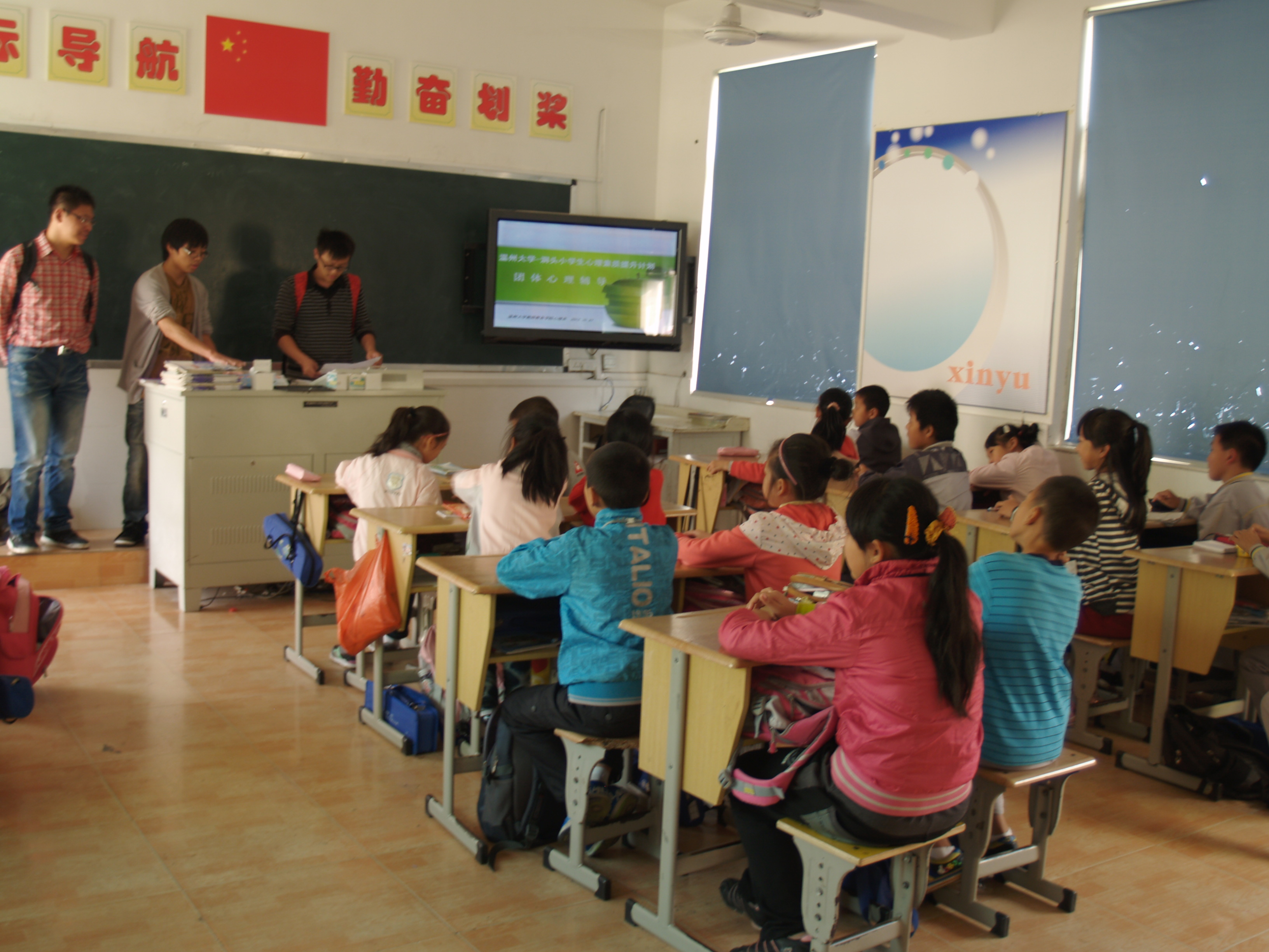 •洞头县人民政府基础教育创新行动计划”,落实心理系 “洞头县东屏镇小、城关二小学生心理健康测试与提升”项目,10月31日下午,心理系22位志愿者来到洞头县城关二小和东屏镇小,为两所学校7个五年级班级开展团体心理辅导。这是在上半年完成两所学校所有学生的心理健康档案后,心理系师生为提升两校小学生心理素质的又一心理服务内容。