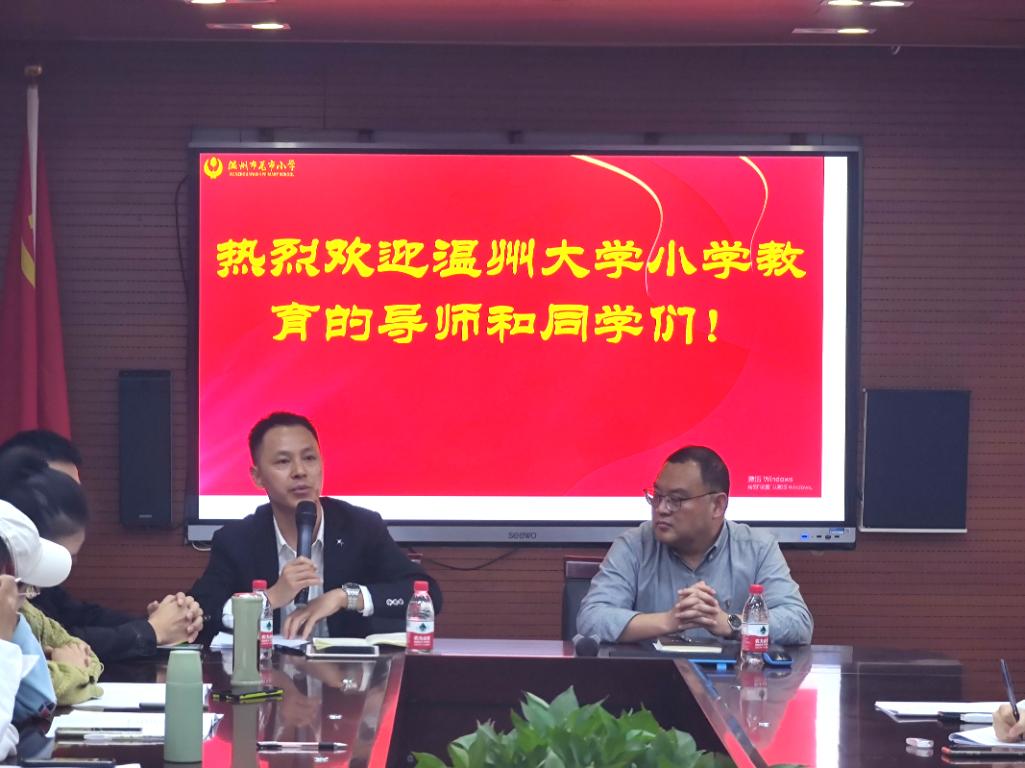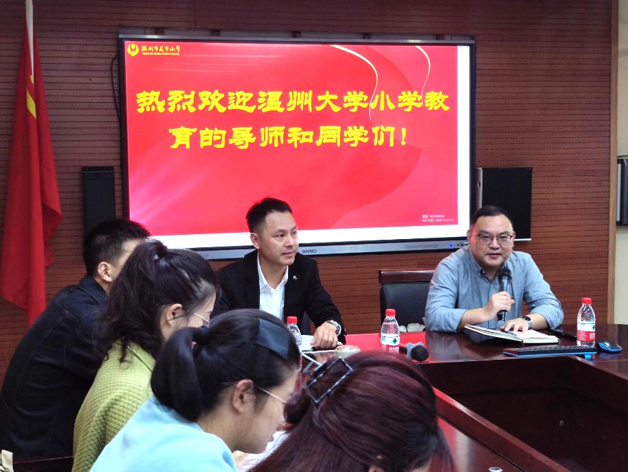 会议伊始,瓦市小学教导处王陈亮老师对瓦市小学的全貌做了简单的介绍,让第一次来瓦小的温大研习生们对瓦小有了更全面的了解。在王老师的讲解中,研习生们了解到,温州市瓦市小学是一所具有百年历史的东瓯名校,培养出了一批又一批发展全面、学有特长、富有创新和实践能力的科学家、文学家、艺术家、世界冠军以及各行各业的建设者与劳动者,在人才培育上成就卓越。同时,学校自2007年起开始集团化教学,目前已有瓦市、江滨、中山、育英四个校区,师资力量雄厚,名师荟萃,其中“一校区一品牌”的特色课程更是远近闻名,如瓦市校区的儿童哲学、江滨校区的国际象棋、育英校区的快乐乒乓和中山校区的墨韵国画。通过王老师的介绍,研习生们感受到了瓦小校园活动之丰富、历史之悠久。