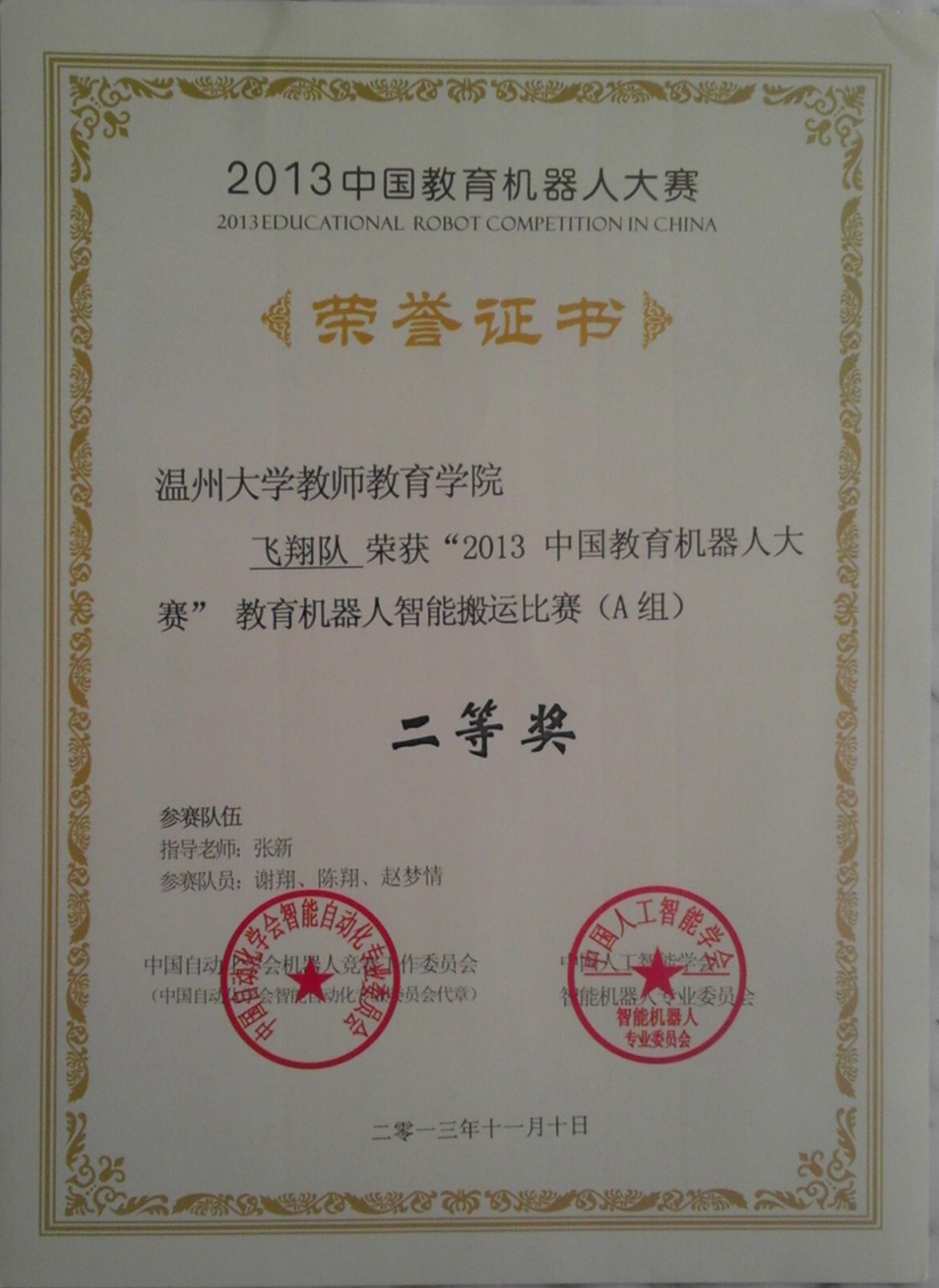 2013年11月9-10日,由中国自动化学会机器人竞赛工作委员会、中国人工智能学会主办2013中国教育机器人大赛在南京工程学院举行,来自全国大中专院校的130多支队伍参赛。比赛的两天时间里,进行机器人创意设计、机器人擂台、机器人智能搬运、机器人搬运码垛、机器人灭火、机器人游中国等比赛。由成人色情 小学教育系11小教科学班的谢翔、陈翔、赵梦情组成、张新老师指导的成人色情 教师成人色情 飞翔队荣获“2013中国教育机器人大赛”教育机器人智能搬运比赛(A组)二等奖。