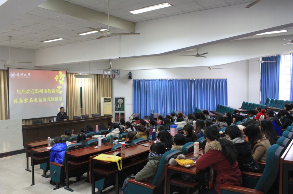 学前教育系特邀温州市教育局张志宏副局长来我校讲学,专题讲解我市学前教育发展现状及对幼儿教师发展需求等问题。讲座由孙芙蓉副院长主持。学前教育系曾国、陈旭微、郑薏苡、林炎琴、林琛琛、杨婧等教师以及来自12学前教育专科毕业生近百名师生聆听了讲座。