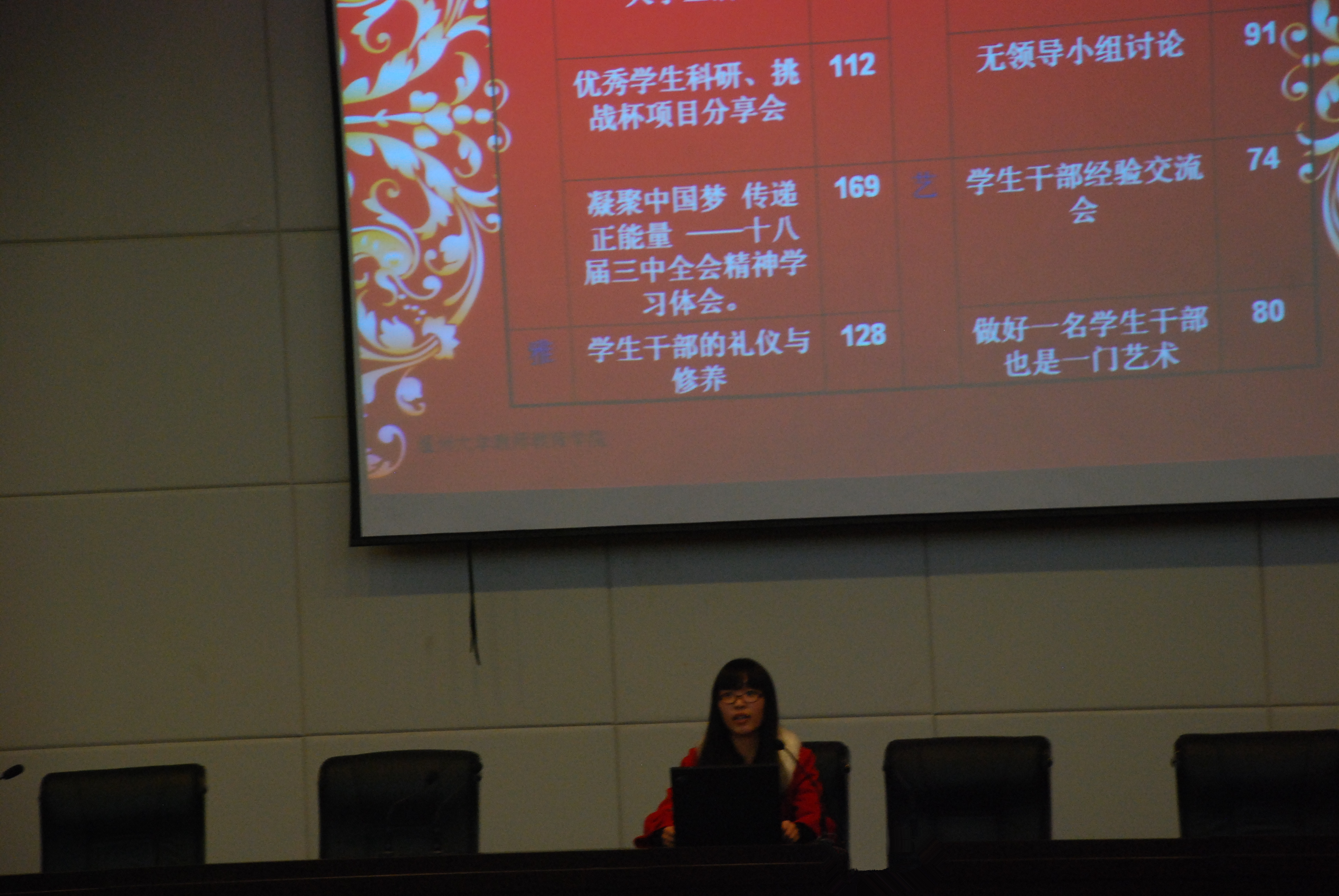 结业典礼共分三议程。第一项议程,本次学生骨干培训班学生辅导员代表黄惠对本次培训作总结汇报。第二项议程,沈丹、蒋宜航、左代玉和桂露颖作为各组学员代表分享小组讨论成果。第三项议程,蔡联群书记为优秀学员颁发证书。