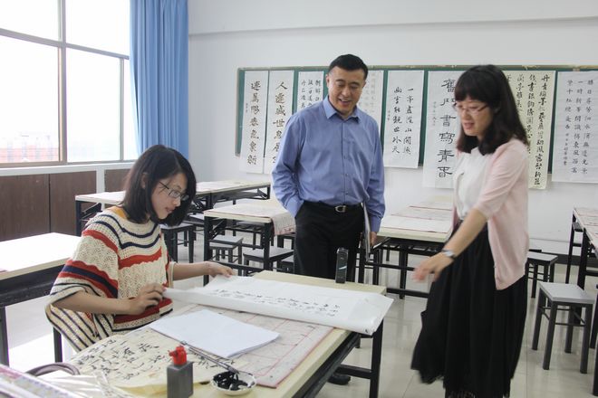 随后,老师们参观了书法教学实验室,实验室里书法作品行、草、篆、隶各体皆备,作品内容丰富,体裁形式多样,老师们赞叹不已。(摄影:胡铸鑫)